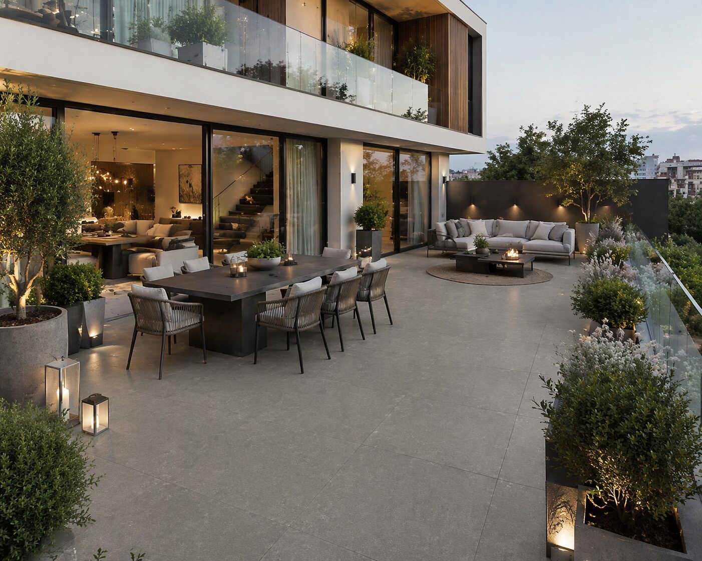 Dlažba s betónovým vzhľadom dodá exteriéru moderný a minimalistický štýl. Vysoká odolnosť a protišmykový povrch zaručujú bezpečné a praktické používanie.