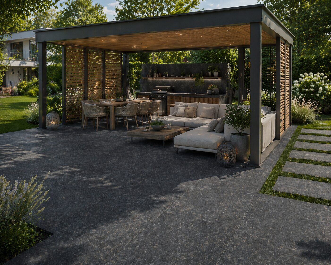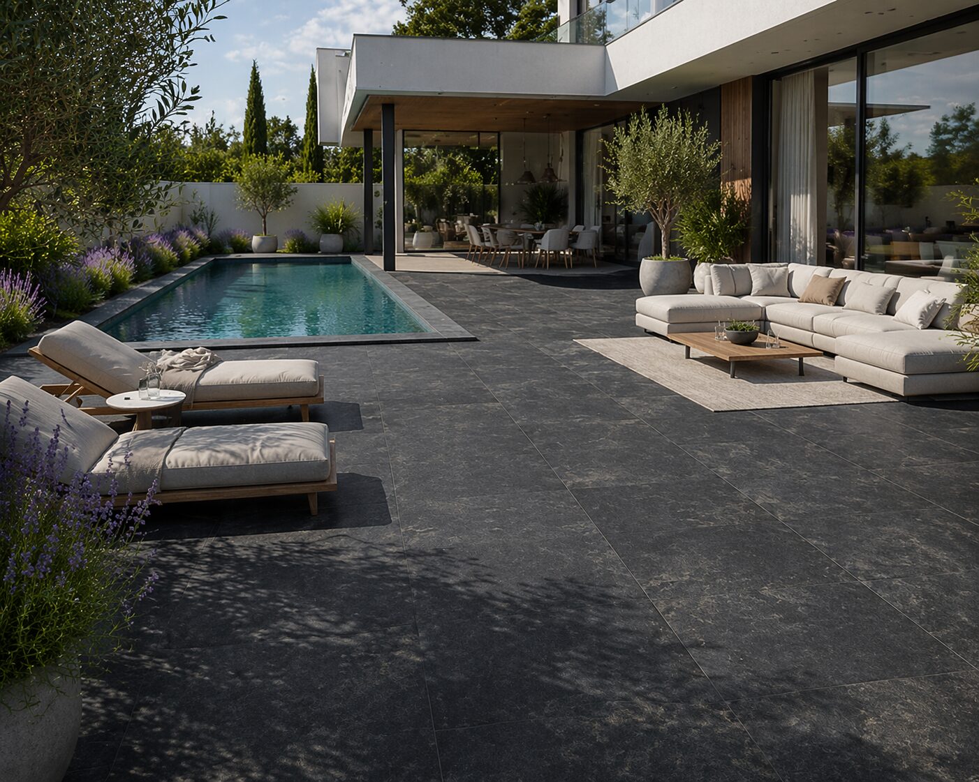 Elegantná čierna dlažba s kamenným efektom dodá exteriéru moderný a luxusný vzhľad. Vysoká odolnosť a protišmykový povrch zaručujú bezpečné používanie počas celého roka.