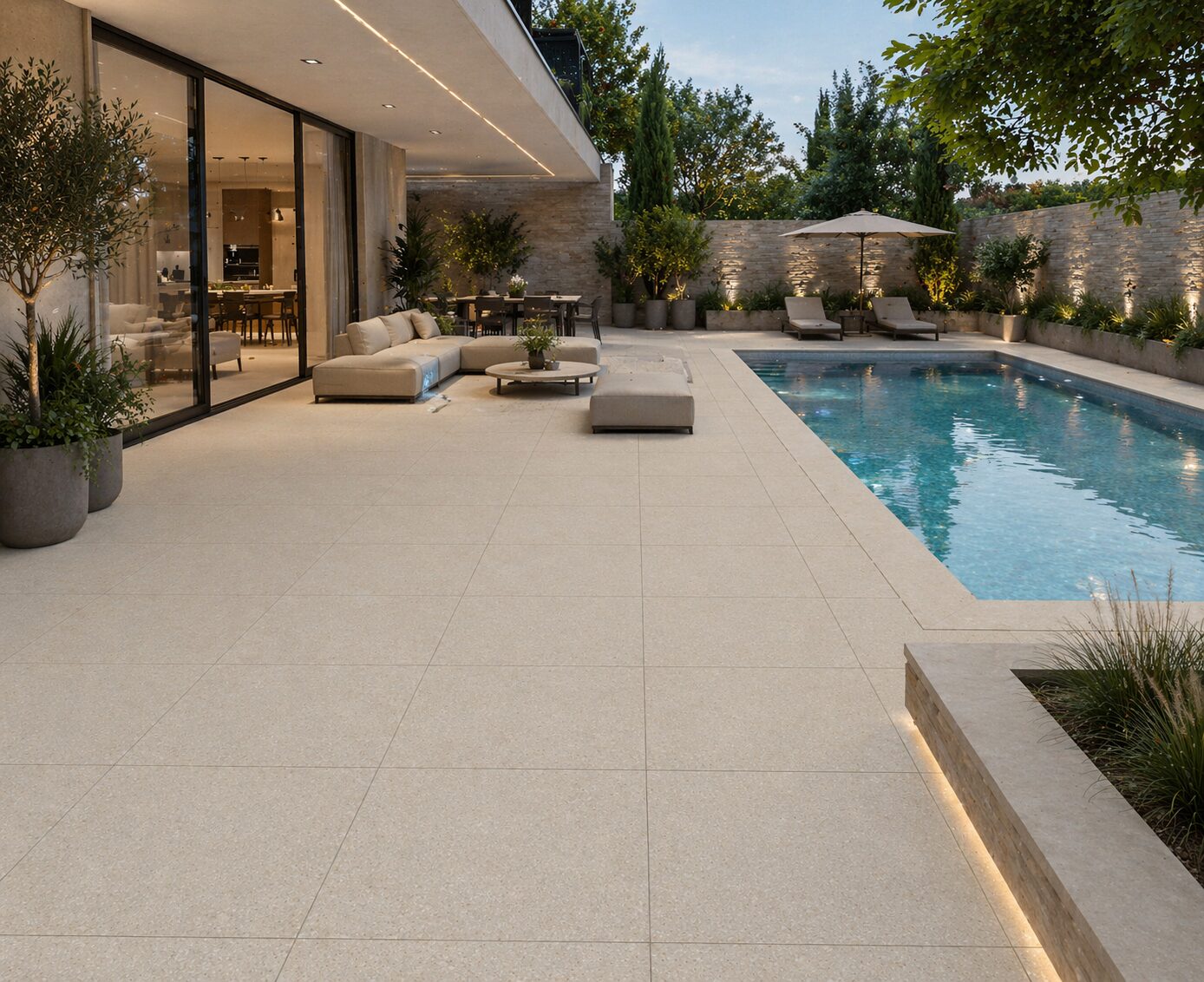 Svetlá gresová dlažba v krémovom odtieni s prirodzenou štruktúrou kameňa dodá exteriéru elegantný a nadčasový vzhľad. Vysoká odolnosť, protišmykový povrch a jednoduchá údržba z nej robia ideálnu voľbu pre každodenné použitie.